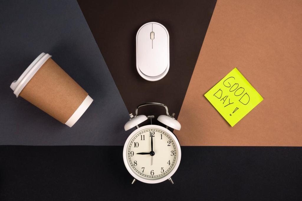 Adopt a simple rhythm, such as alternating thirty minutes seated with twenty minutes standing, or pairing standing with calls and reviews. The goal is consistency, not perfection. Use reminders or desk presets to make switching painless and automatic during natural task transitions.
